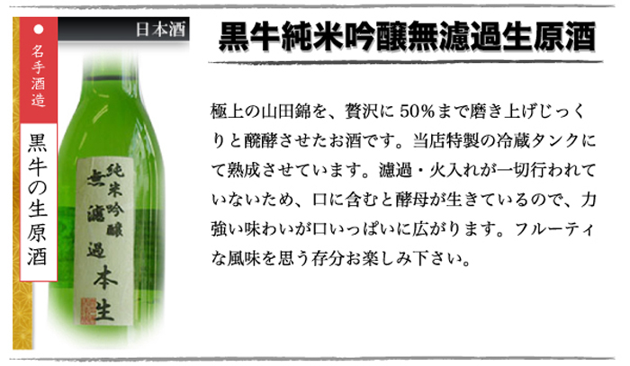 より磨いた酒米(60%以下)と米麹だけで造られたお酒のことを言います当店の黒牛生原酒は純米吟醸で,しかも精米歩合が50%と贅沢な酒米で醸しています。